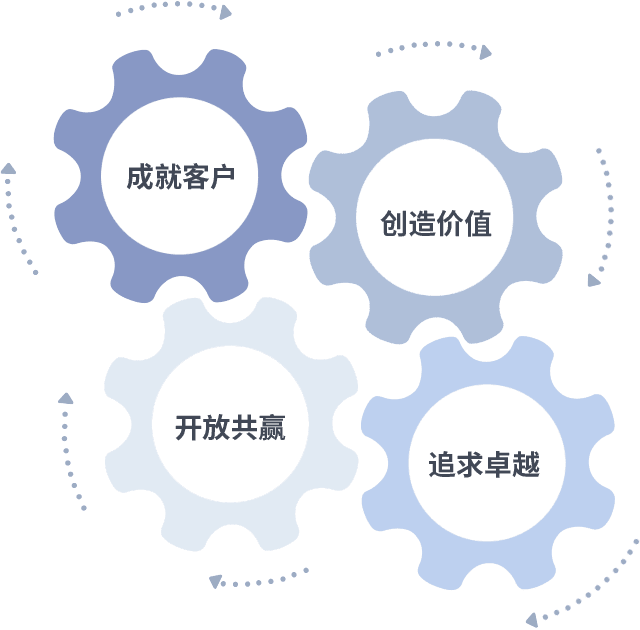 成就客户是一切决策的出发点,,,,创造价值是衡量所有工作的标准,,追求卓越是我们做事做人的态度,,开放共赢是我们的格局也是最终的结果。。。。价值观的齿轮环环相扣,,推动着组织里的每个人不断向前。。。。