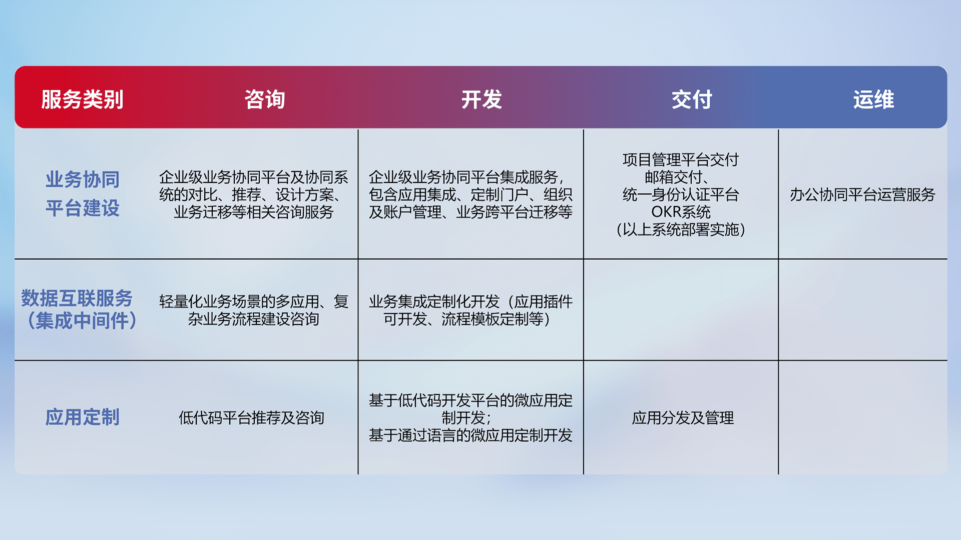 针对钉钉、、、企微、、IDaas等平台级产品提供产品的规划、、方案、、、、交付、、定制化开发等服务,,,,实现如统一协同办公、、、智能客户服务、、、混合会议管理、、、智能数据查询、、等业务场景,,,,实现数字化转型。。。